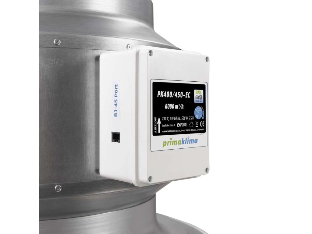 Primaklima BLUE LINE PK400/450-EC je vybaven vysoce účinným německým EC motorem ebmpapst s neuvěřitelným průtokem vzduchu až 6000 m³/h. Ventilátor BLUE LINE je konstruován pro nepřetržitý non-stop provoz (více než 80 000 hodin při plných otáčkách). Ventilátor může pracovat při nízké hladině hluku a zdaleka překonává směrnici o energetické účinnosti ERP2015. Napájecí a řídicí systémy jsou umístěny ve vysoce kvalitní rozvodné skříňce, která je kompletně sestavena s napájecím kabelem Schuko. Předinstalované robustní montážní držáky umožňují dokonalé umístění v místnosti.