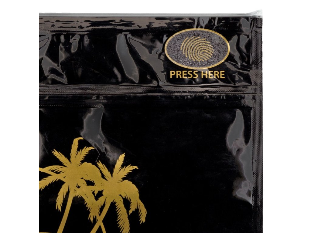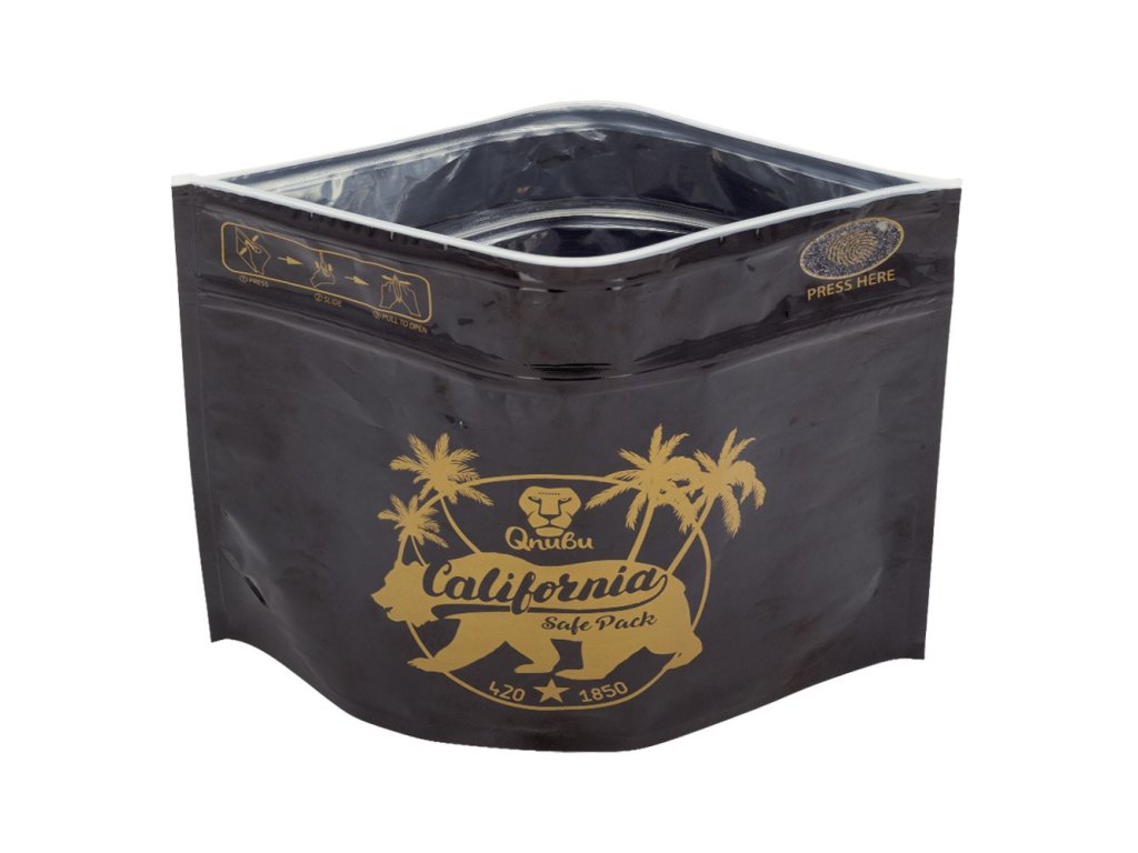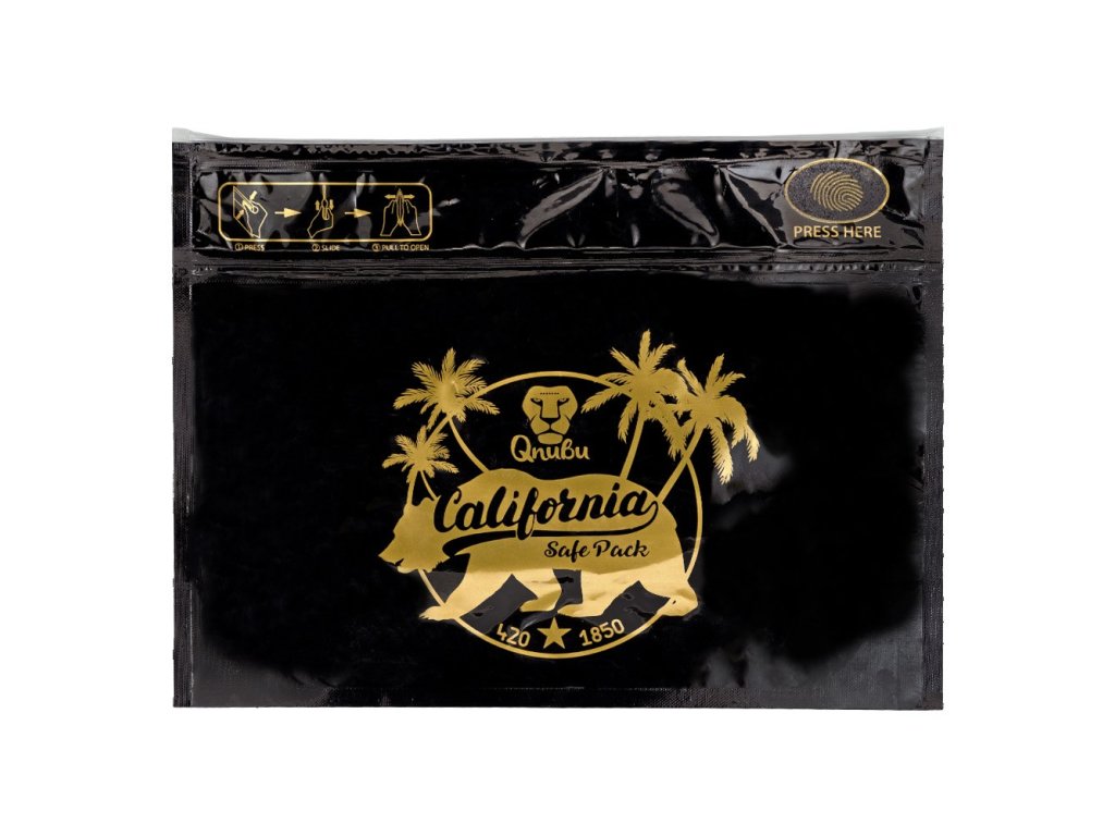 Sáček Press to Open Qnubu California. Odolné proti úniku zápachu. Jednoduché otvírání Press to Open. Dvojitý zip. Kapacita 56 g. 30,5x23 cm.