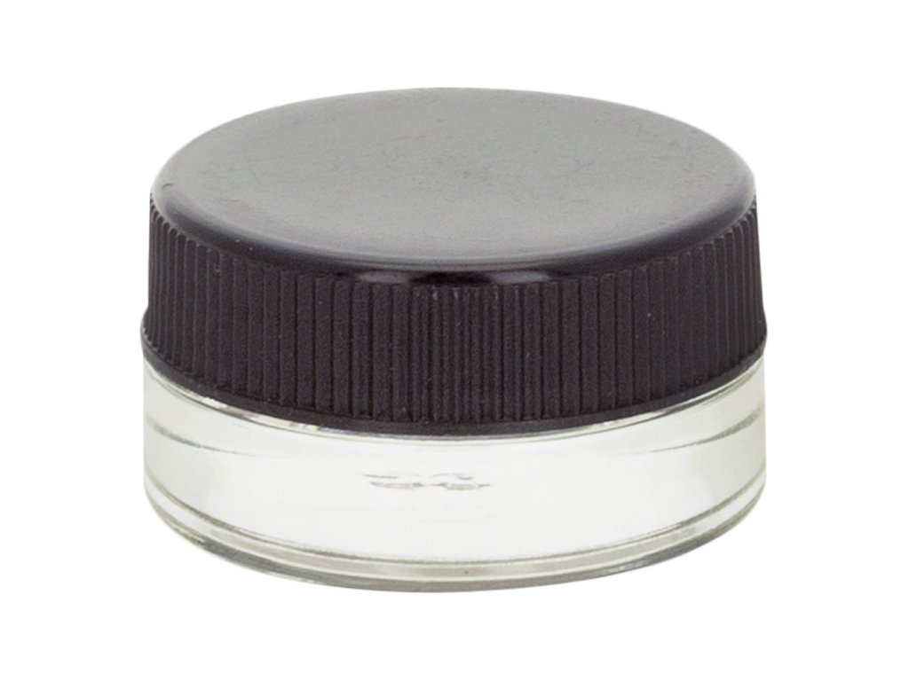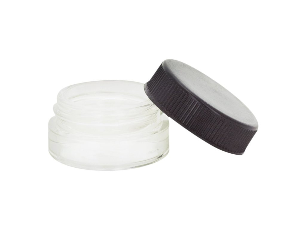 Průhledná sklenice se šroubovacím černým víkem Qnubu California Safe Pack. Borosilikátové sklo. Objem 7 ml.