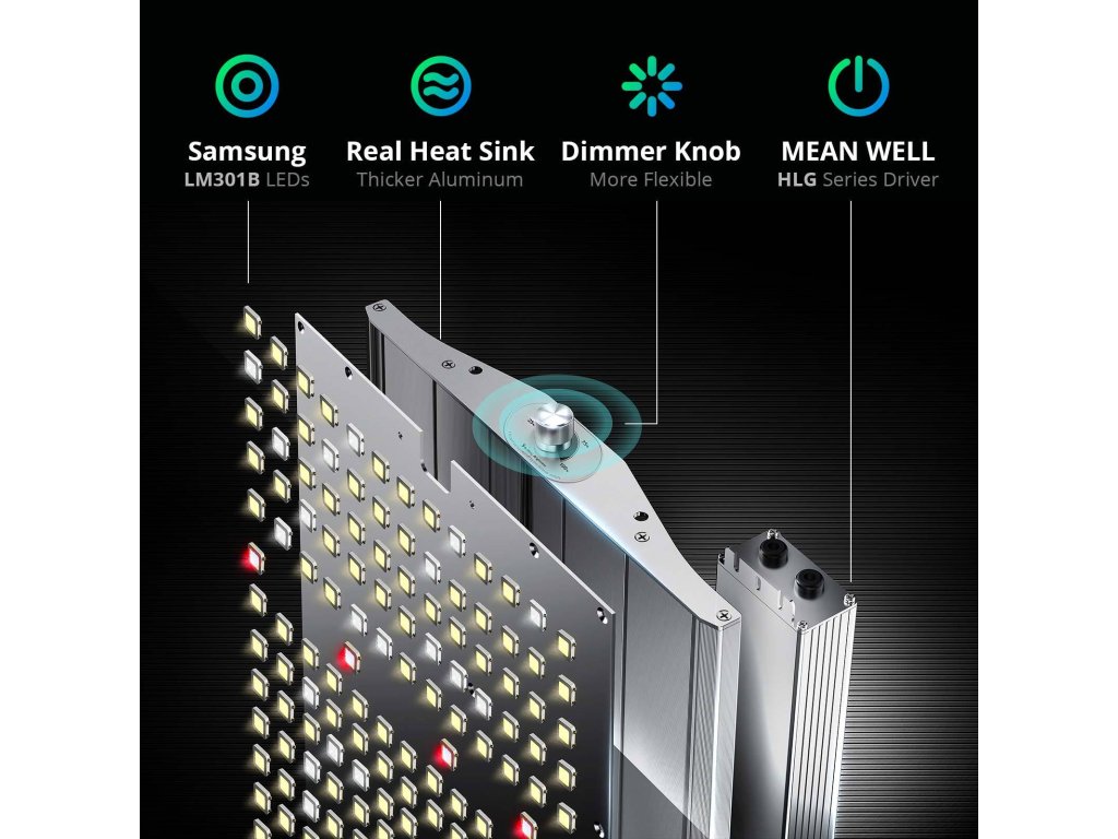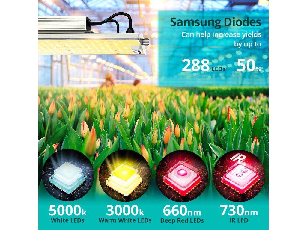 LED čipy - 1008 vysoce kvalitních LED, včetně, 632 teplých bílých LED diod Samsung 3000K, 320 Samsung 5000K bílé LED, 52 660nm tmavě červených LED, 4 730nm IR LED