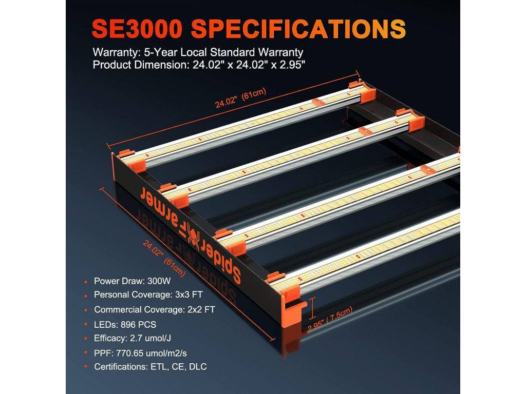 LED osvětlení Spider Farmer SE3000, 300W, PPE 2,75 umol/J plné spektrum. Určeno pro všechny pokojové rostliny.