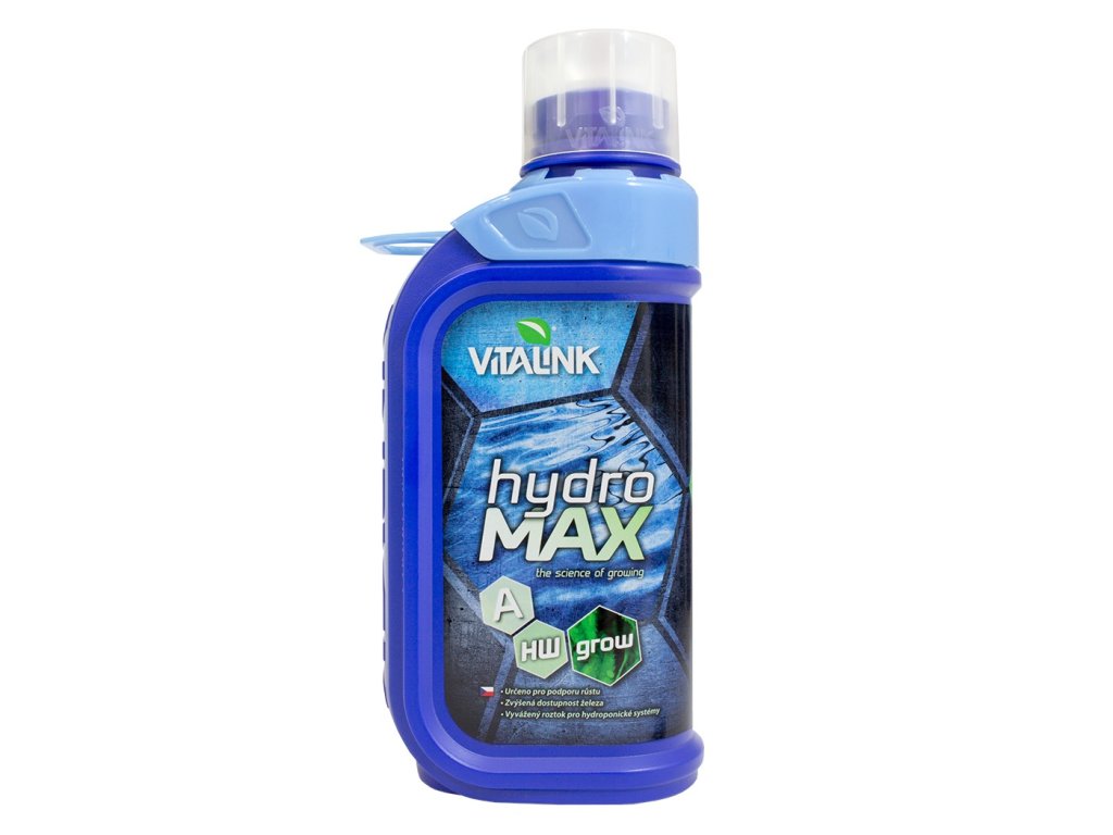 VitaLink Hydro Max GROW A + B HW je kompletní dvousložková rostlinná výživa určená pro pěstování v hydroponických systémech. Obsahuje primární a sekundární živiny se stopovými prvky a fulvokyselinami. VitaLinkHydro MAX je u pěstitelů velmi oblíbený, jelikož podporuje intenzivní a zdravý růst rostlin a napomáhá k dosažení maximálních výsledků. Je vhodný pro použití se všemi inertními médii včetně jílových oblázků, perlitu, skalní vlny a může být použit ve všech cirkulačních hydroponických systémech. Hnojivo VitaLink Hydro Max GROW A + B HW je určené pro použití v oblastech s tvrdou vodou. Hnojivo používejte v době vegetativního růstu.