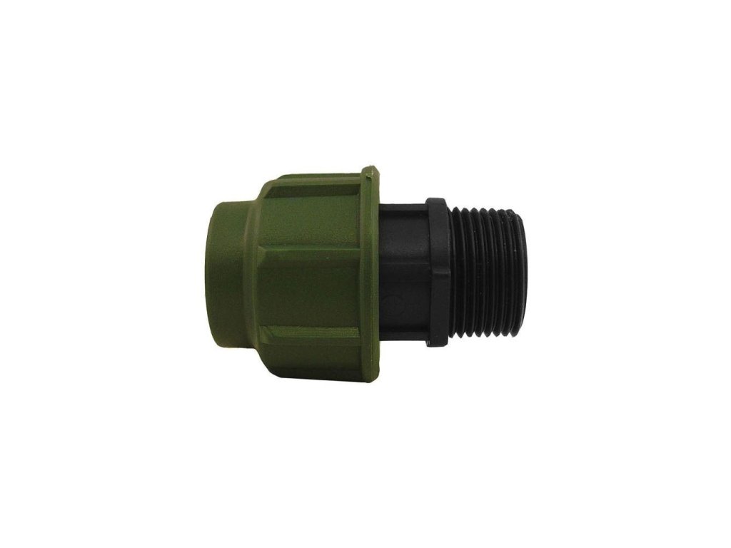 PE díl pro závlahu, který slouží jako redukce hadic o průměru 25 mm na 3/4″ vnější závit.